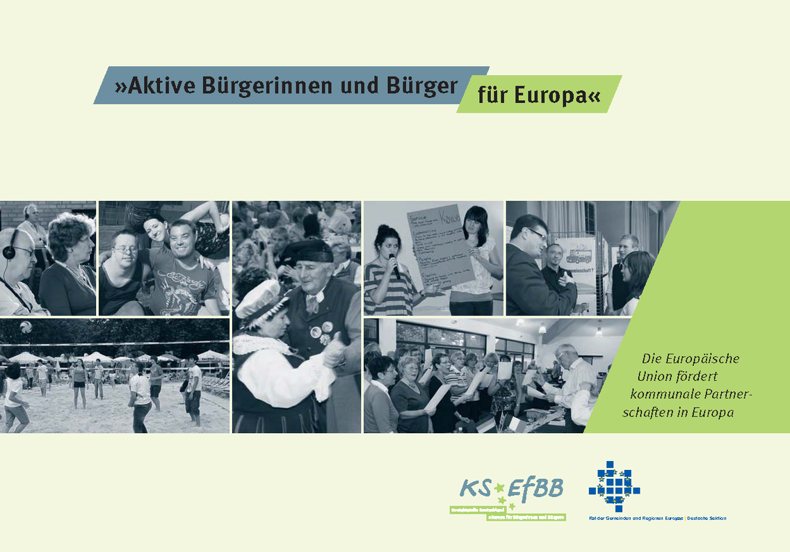 Die Deutsche Sektion des Rates der Gemeinden und Regionen Europas (RGRE) und die Kontaktstelle Deutschland "Europa für Bürgerinnen und Bürger" (aktuell Kontaktstelle für das Förderprogramm "Citizens, Equality, Rights and Values" (CERV) haben im November 2012 ihre gemeinsame Broschüre "Aktive Bürgerinnen und Bürger für Europa" veröffentlicht.